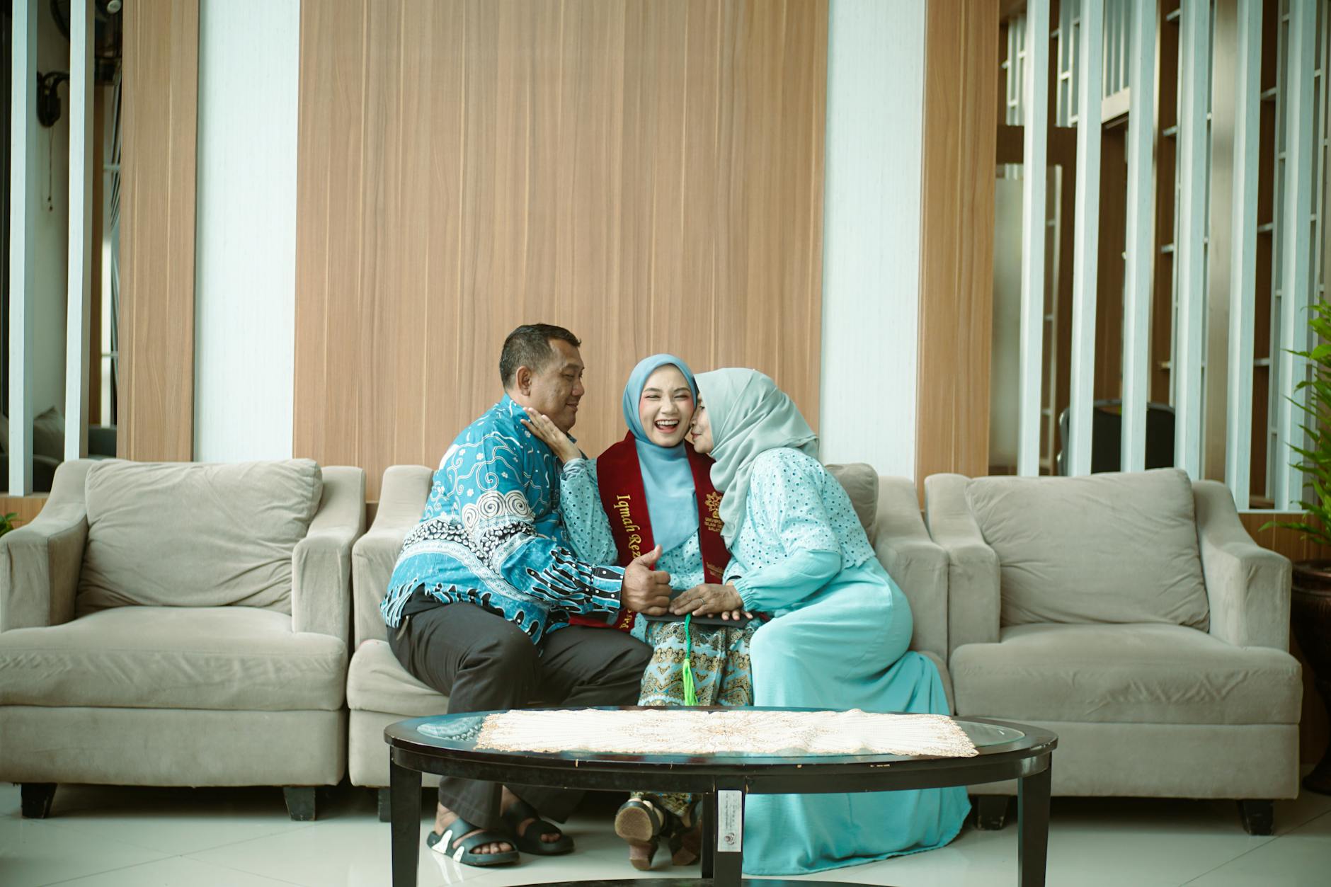 Happy family celebrating a graduation achievement, sitting on a sofa in a cozy indoor setting.